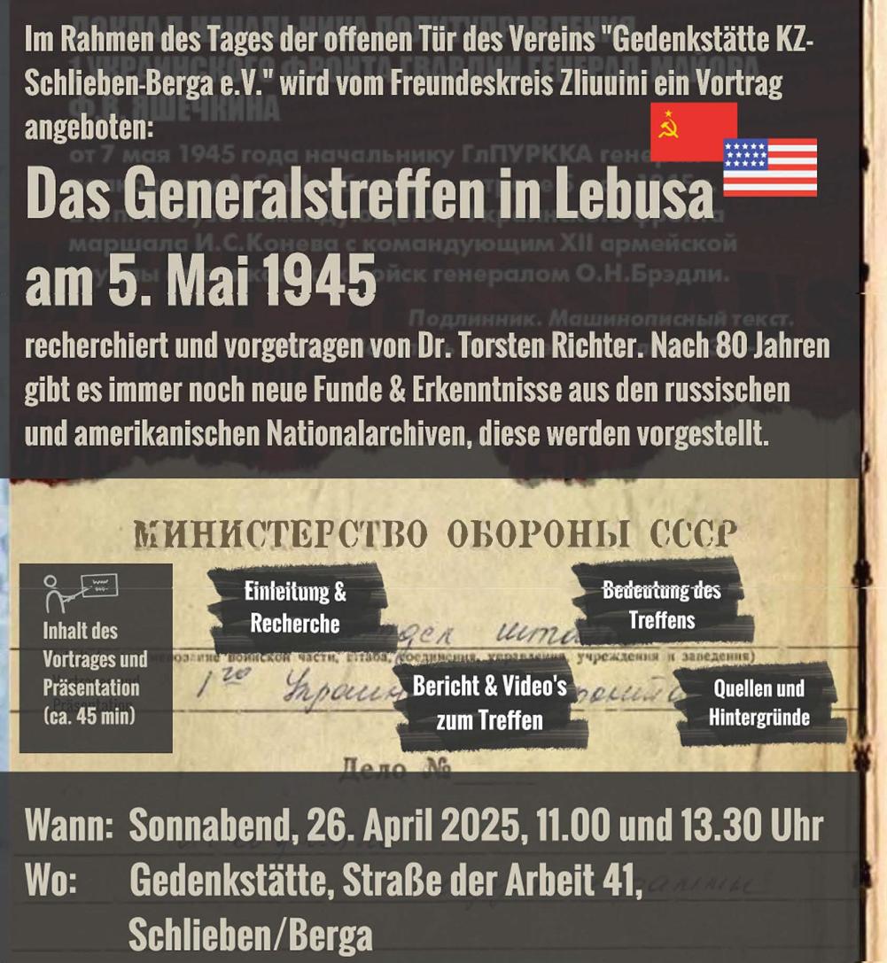 Im Namen des Vorstands des Vereins "Gedenkstätte KZ-Außenlager Schlieben-Berga e.V." wurde der Freundeskreis Zliuuini eingeladen, zu dem am 26.04.2025 geplanten Tag der offenen Tür der Gedenkstätte einen Vortrag zum Generalstreffen in Lebusa vom 5. Mai 1945 zu halten. Der Tag der offenen Tür ist dem 80. Jahrestag der Befreiung des Lagers in Schlieben (21.04.1945) gewidmet. Diesem Ansinnen haben wir gerne zugestimmt und laden auch Sie ganz herzlich zum Vortrag, der von Herrn Dr. Torsten Richter gehalten wird, ein.