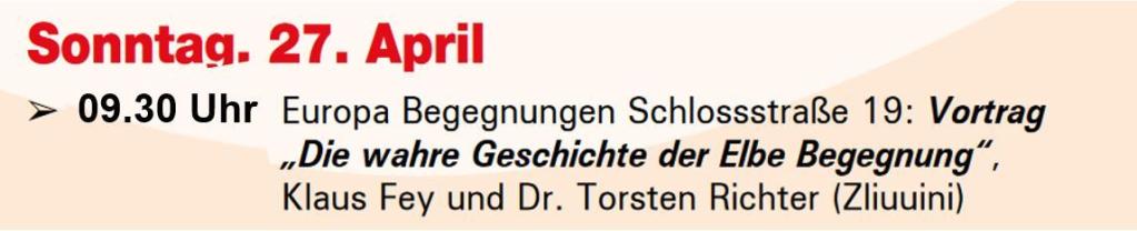 Die Begegnung der sowjetischen und amerikanischen Truppen 1945 in Torgau wird anlässlich des Elbe-Days in Torgau zum 80. mal begangen. Hierzu wurden wir als Freundeskreis Zliuuini eigeladen, zu dem inhaltlich mit diesem Jahrestag zusammenhängenden Generalstreffen in Lebusa vom 5. Mai 1945 näher einzugehen. Hierzu erfolgt zusammen mit Herrn Klaus Fey ein Vortrag zum Thema "Die wahre Geschichte der Elbe Begegnung". Alle Interessenten sind zum Vortrag in Torgau herzlich eingeladen, der Eintritt ist frei.