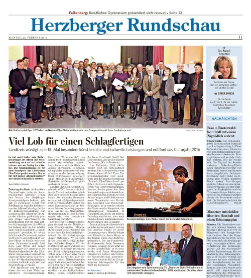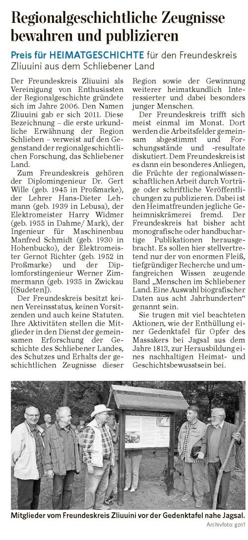 „Mit der Auszeichnung des Freundeskreises Zliuuini wird dessen herausragende Leistung bei der Erforschung und Vermittlung der Heimatgeschichte gewürdigt. Der Freundeskreis Zliuuini als Vereinigung von Enthusiasten der Regionalgeschichte gründete sich im Jahre 2006. Den Namen Zliuuini gab er sich 2011. Diese Bezeichnung- die erste urkundliche Erwähnung der Region Schlieben- verweist auf den Gegenstand der regionalgeschichtlichen Forschung, das Schliebener Land.