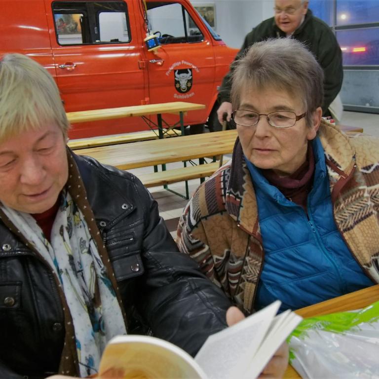 Auf den Fotos sind neben der Vorsitzenden Karola Wilde (ganz links), auch Christine Radens und Christine Neubert vom Heimatverein Schwarzenburg zu sehen. Gast war auch u.a. der bekannte Malitschkendorfer Holzschnitzer Gisbert Mönnich (rechts vor dem Fenster).
