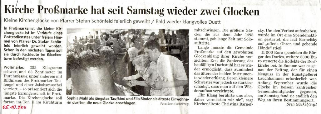 In Proßmarke ist die kleine Kirchenglocke im Verlaufe eines Gottesdienstes unter freiem Himmel von Pfarrer Dr. Stefan Schönfeld am 01.10.2011 feierlich geweiht worden.