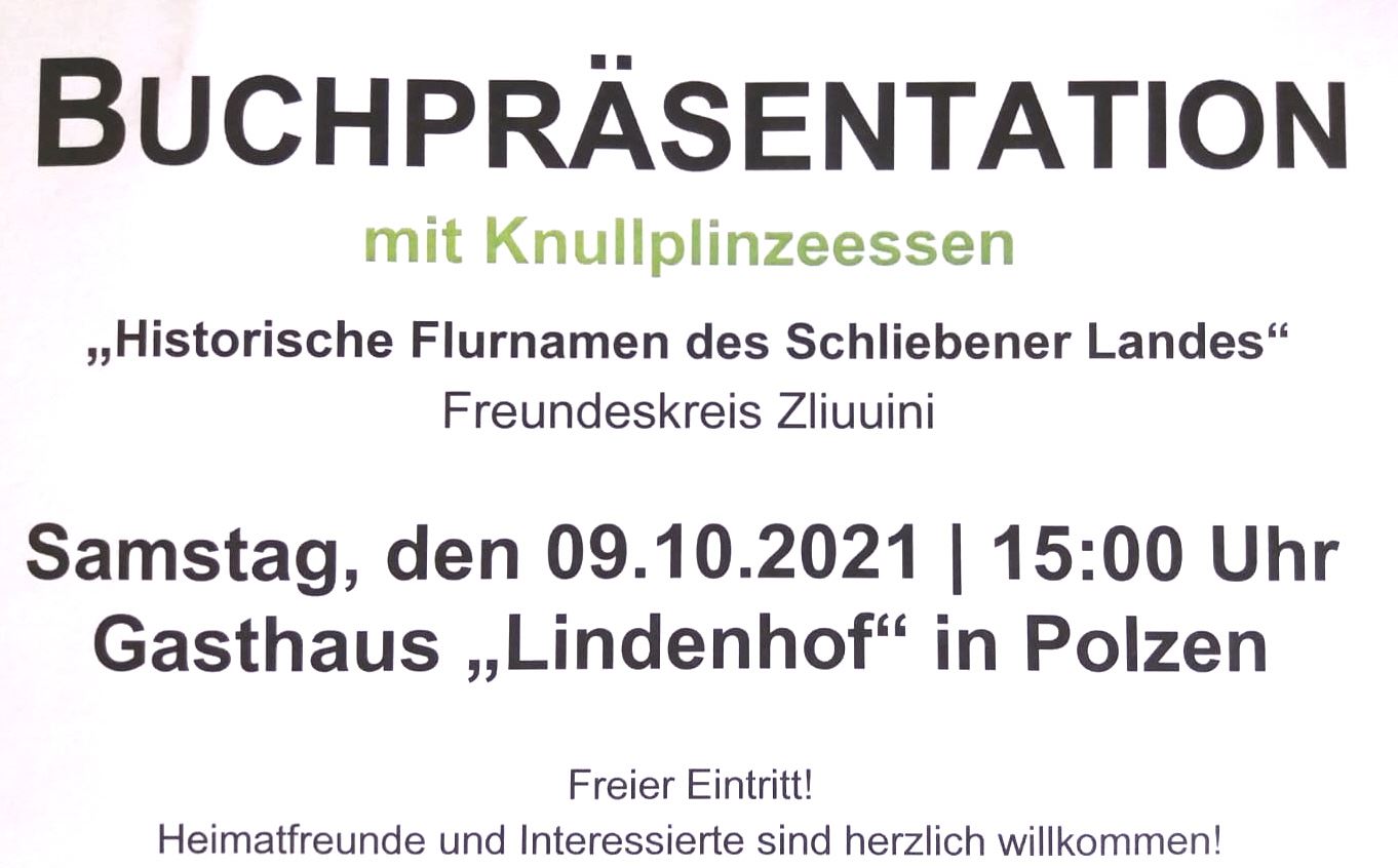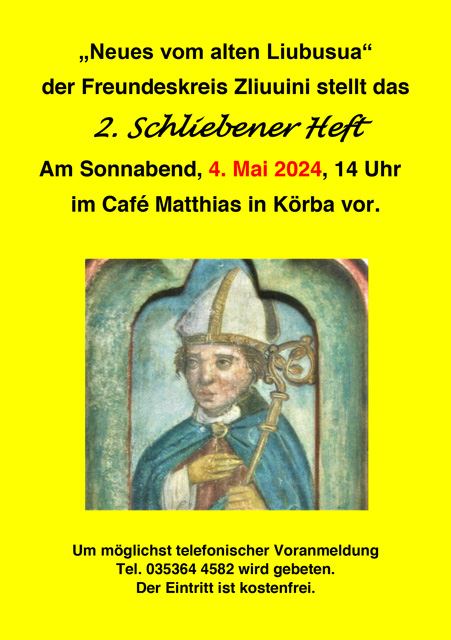 Nach diesem Vortrag stellt der Freundeskreis Zliuuni als Veranstalter am 10. April 2025 ab 16:45 Uhr in gesonderter Präsentation sein neues Heft der Reihe „Schliebener Hefte“ Nr. 4 vor. Hier sind alle Daten aus dem obigen Vortag detailliert dargestellt, verbunden mit weiteren Angaben, bebildert und mit den historischen Quellen versehen.