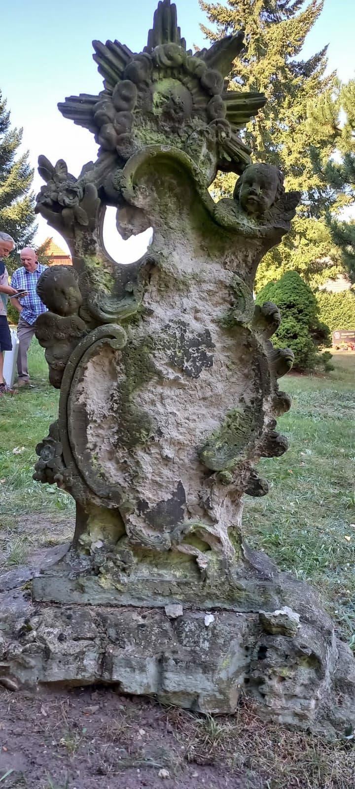 Die vordere Seite weist massive Materialschäden auf, die als chemische Folge der Salzbelastung des Sandsteins und der Witterung typisch sind. Dadurch wurde die Oberfläche des Inschriftenfeldes auf der Vorderseite völlig zerstört. Der obere Teil des Grabsteins wird von einer riesigen Sonne gekrönt, auf der eine Girlande von aufgesetzten Lilienblüten einen Kreis bildet, nur wage lässt sich das Profil einer Dame vermuten. Die Sonne steht für den Urquell des ewigen Lebens, für Liebe,Auferstehung und für das nie erlöschende Licht. Sie spendet Licht, auch göttliche Erleuchtung, Wärme und Kraft. Mit den gut erhaltenen geschwungenen asymmetrischen Verzierungen (Rocaillen), wie Blumenornamenten, Akanthusblättern und kleinen Engelsköpfen (Putten) ist der Grabstein ein typischer Vertreter des 18.Jhdts. Die Putten hat man gern benutzt, um ein vom Charakter ernstes Thema etwas Leichtigkeit zu geben.