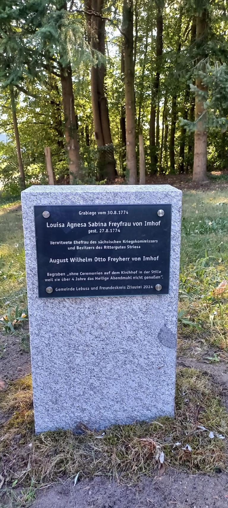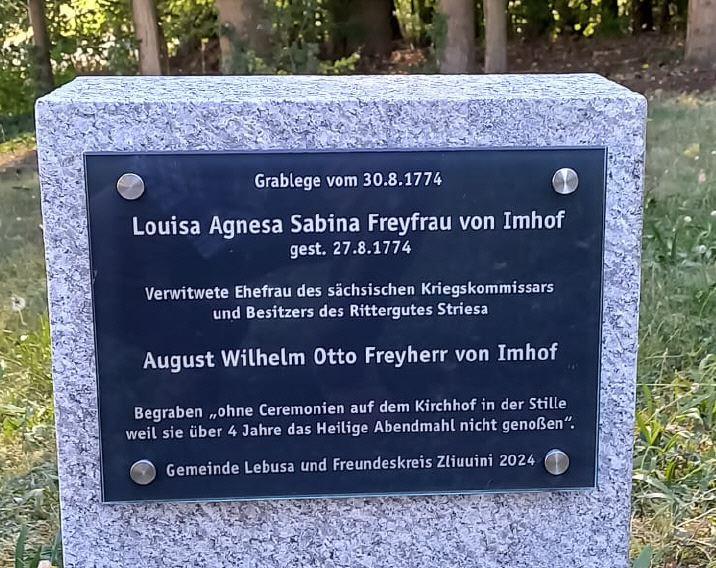 Am Sonntag, 08.09.2024 wurde vom Freundeskreis Zliuuini und der Gemeinde Lebusa eine Gedenktafel für "Louisa Agnesa Sabina von Imhof" eingeweiht. Da die Inschrift des originalen Gedenksteins kaum noch lesbar war, erfolgte die Aufstellung eines Natursteins mit einer gravierten Platte. Die Recherchen zu diesem Thema führte federführend Frau Rosi Schubert aus Schleiben durch, eine Beschreibung und Impressionen von der Einweihung wurden dokumentiert.