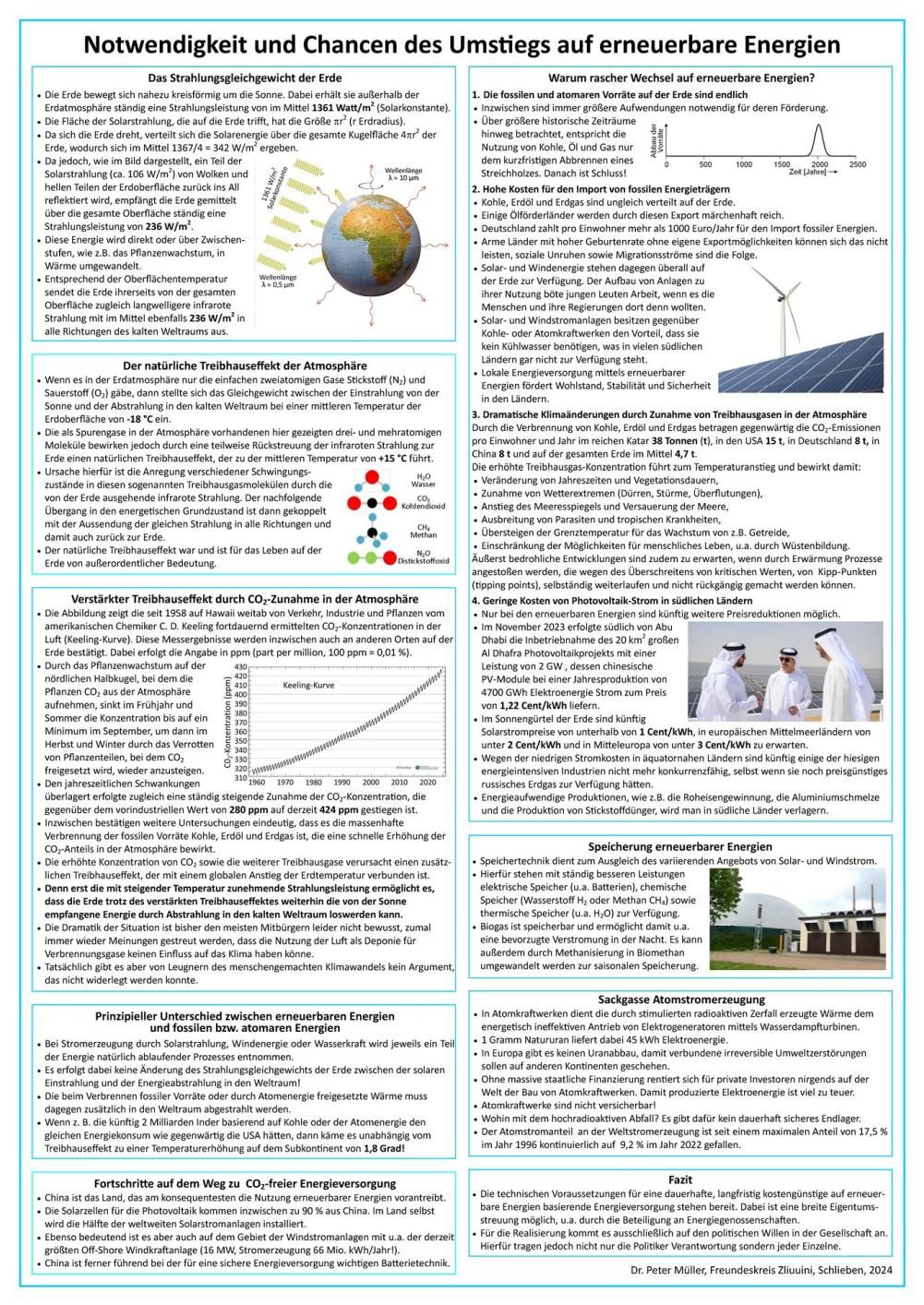 Herr Dr. Peter Müller hat sein Wissen am 07.04.2025 zum Thema der Nutzung der solaren Energieeinträge auf der Erde in einem Poster und weiteren Anmerkungsseiten zusammengefasst. Das Informationsmaterial wird aktuell für den Physikunterricht in der Schliebener Schule genutzt werden. Für Interessierte stellt unser Freundeskreis-Mitglied Dr. Peter Müller die Unterlagen zur freien Verfügung.